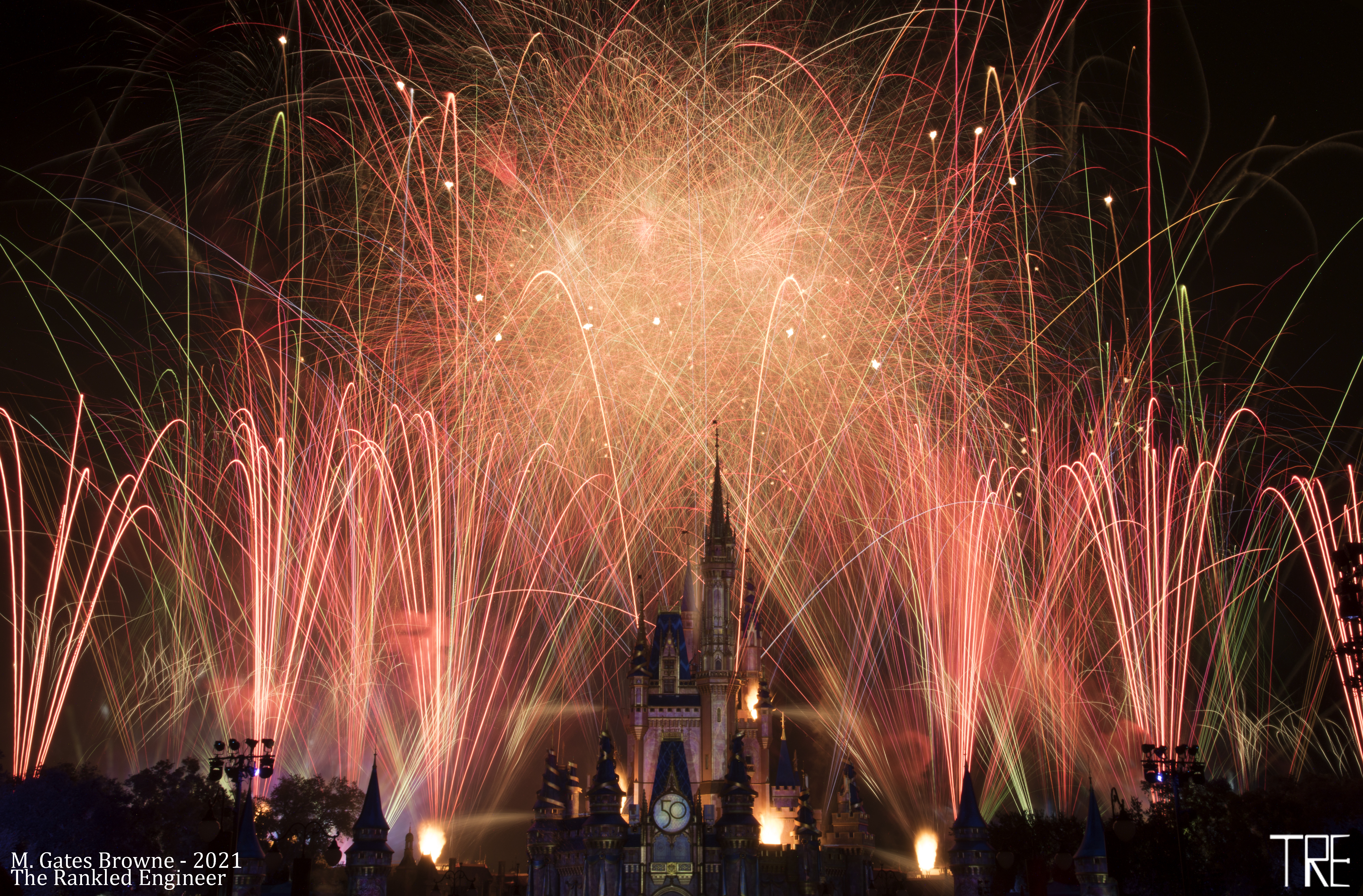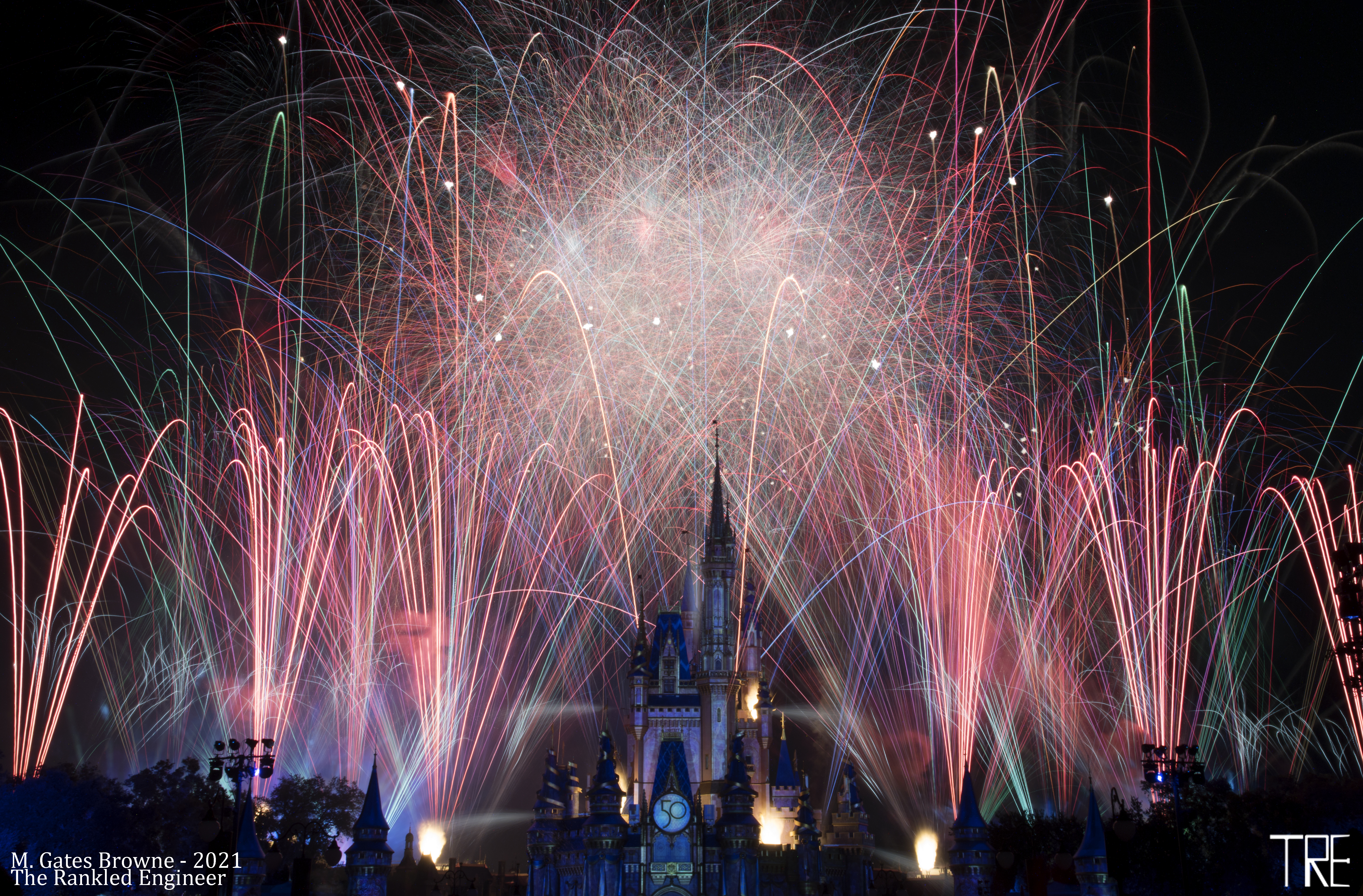 Happily Ever After – Magic Kingdom, Walt Disney World Fully Happily Ever After Show in One Exposure. ISO100, F/22, 8-stop ND Filter, Exposure Length 1105sec. Happily Ever After Fireworks – Full Fireworks Show (Tungsten WB) Happily Ever After Fireworks – Full Fireworks Show (Daylight WB)